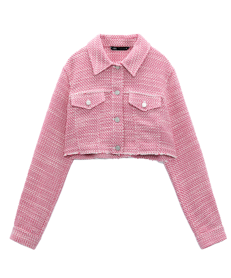 This cropped textured jacket from Zara will make a stylish addition to our wardrobes. The fuchsia colour is the standout component of the jacket as well as the boucle textured material ensuring to keep you warm. Paired with jeans and ‘a nice top’ it will take a casual outfit and make it classy. The boucle style jacket is usually one we associate with an expensive price tag however not this one!