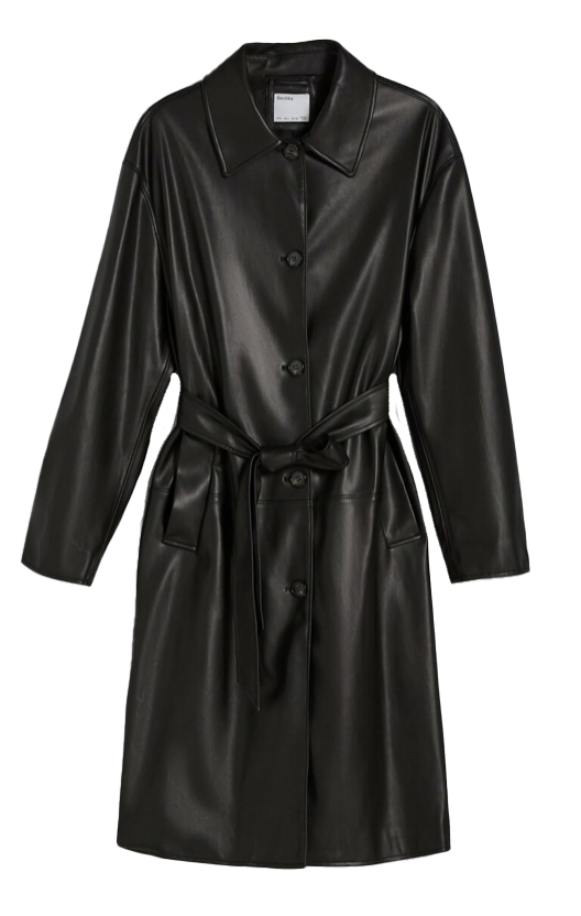 The trench coat is a well-loved piece in our autumnal outerwear collections and this year it has a leather twist. You will be happy to know too you do not have to splash out the cash for one either. This faux leather black trench coat from Bershka has a tie waist detailing which is flattering on the body and the belt adds an expensive touch to the coat. The smooth black material will go with everything as well making it a good investment piece and the collar adding a smart touch.