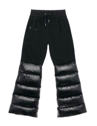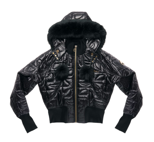 The clothing line merges Y2K streetwear style and ski vibes – cropped bomber jackets with furry hoods, quilted faux fur-lined hoodies, two quilted monogram print coats, puff headbands, mockneck sweaters emblazoned with Telfar’s logo in gold and high-waisted snow trousers with fur trims down the calf. All the items come in only two colours, black and white, and they all match the texture and styles of the bags.