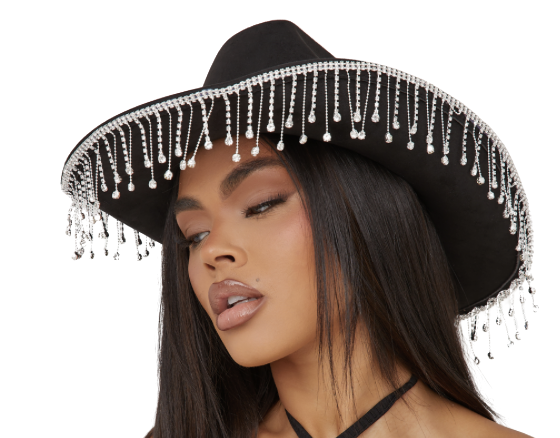 Beyoncé was giving ‘Formation’ with this wide-brimmed hat and a custom diamanté leotard from Balmain FW23. The bodysuit featured an intricate pearl web, matching her pearl-rimmed cat eye sunglasses, and was styled with black vinyl thigh-high boots.