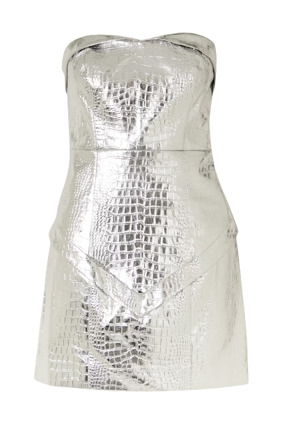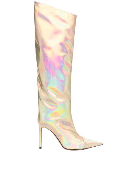 David Koma, who also designed Bey’s Oscars performance look last year, created this custom ensemble inspired by his SS23 collection. The look consisted of a turtleneck bodycon dress with a ruched, high-low skirt, a long iridescent metallic coat, chunky silver earrings, and holographic asymmetric cowboy boots.