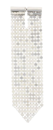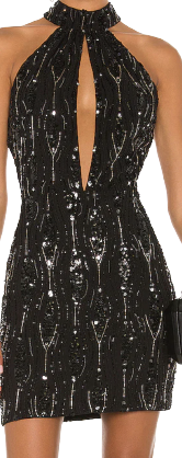 A classic afterparty look now with Chlöe wearing a black sheer dress adorned with jewels from the waist down and a matching sheer top with a cross of embellished jewels across the chest. A pair of sleek black heels match the dress well and a choker and huge hooped earrings add some more silver without ever going too far.