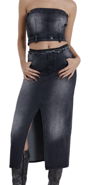 Kylie being classically Kylie in an elegant, full-black fit. Strapless pieces have rocketed in popularity recently and if you keep an eye out you will see them all over your feeds. Definitely a style we can get behind and show some support for. The denim corseted bodice is cut roughly at the top which gives the elegant look a rugged flair. We are all about this look and hope we see Kylie in more rugged chic styles.