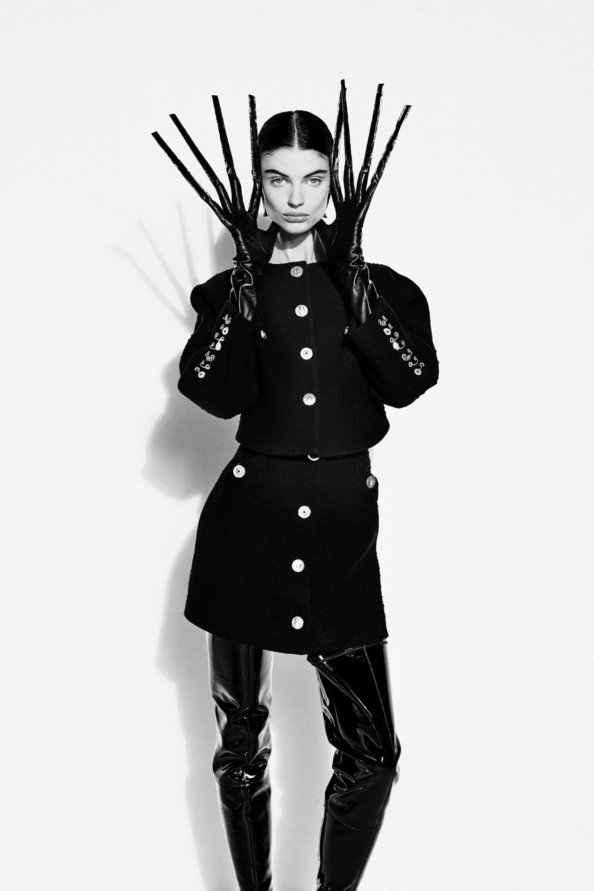Daniel Roseberry also drew inspiration from gothic cult movies, like Tim Burton’s Edward Scissorhands, as model Mila Vaneeten was accessorised with knives posing as gloves. The model’s gleaming smiles contrasted the moody garments as Rouguy posed in a monochromatic black look featuring iconic cones, studs, and swirls that the brand has become known for.