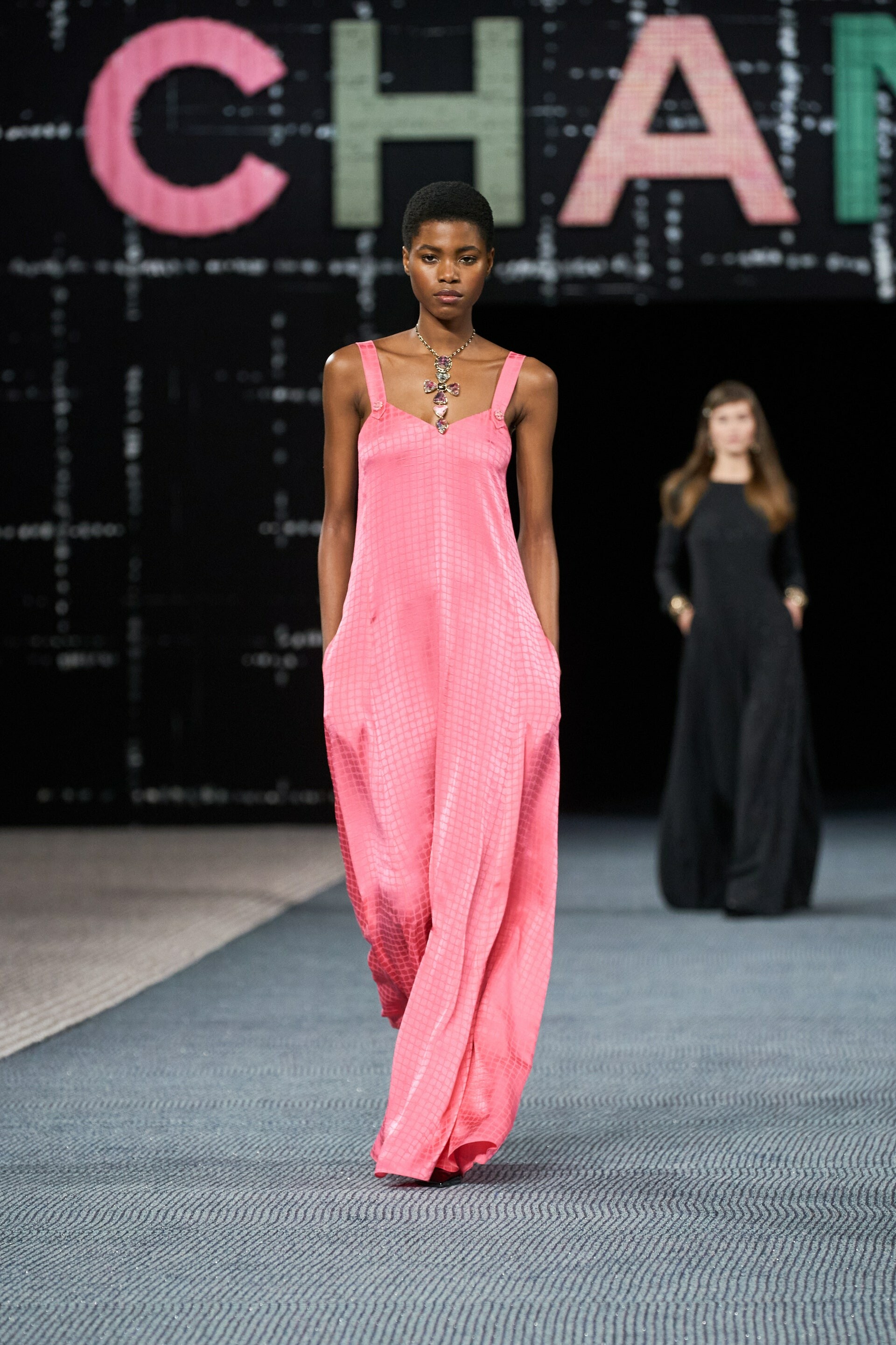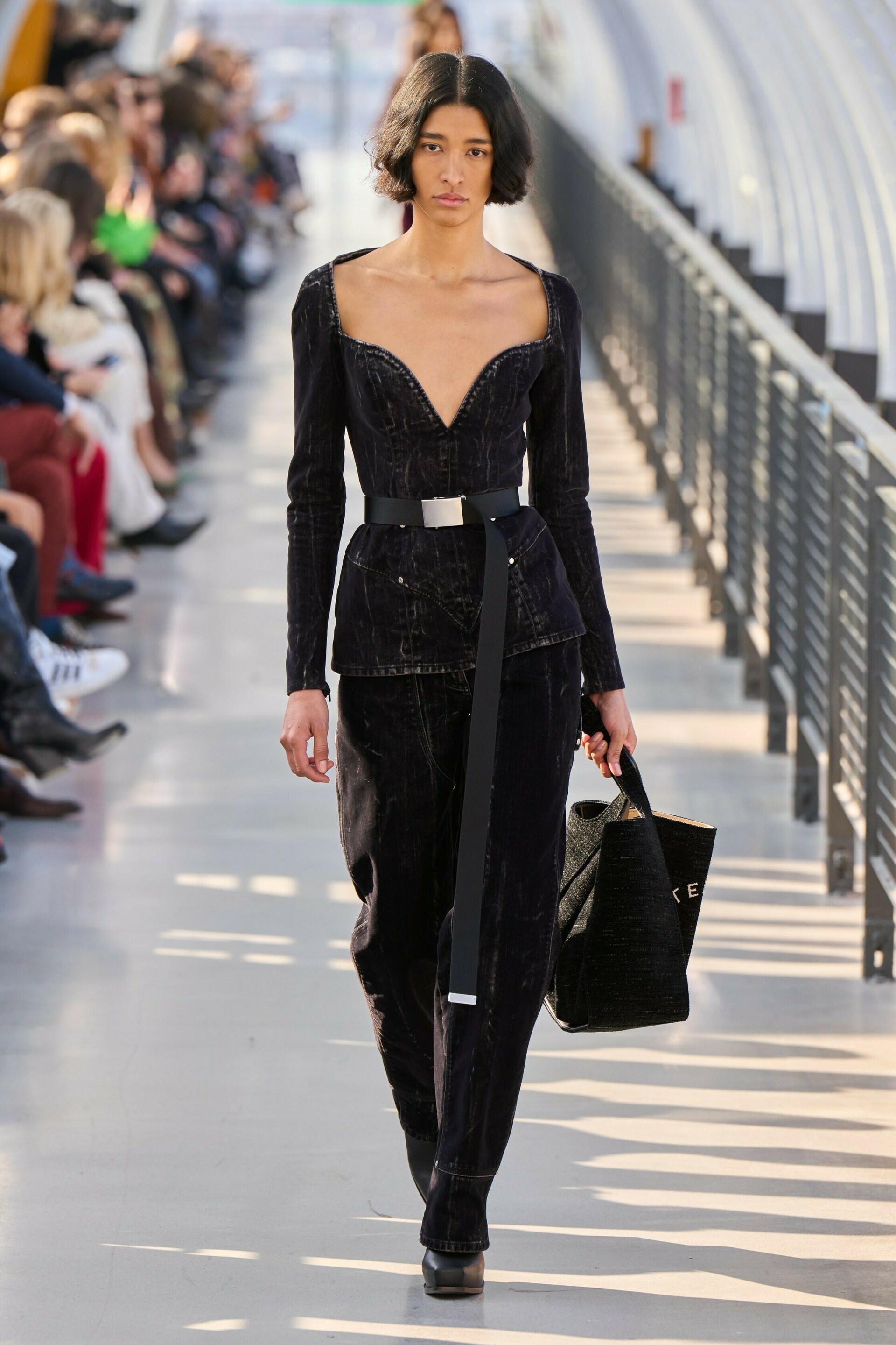 The show’s audience was filled with the fashion house’s muses. Sarah Paulson and Emma Chamberlain sat in the front row, a prime spot to watch Squid Game’s HoYeon Jung open the show in a brunette boxy jacket.