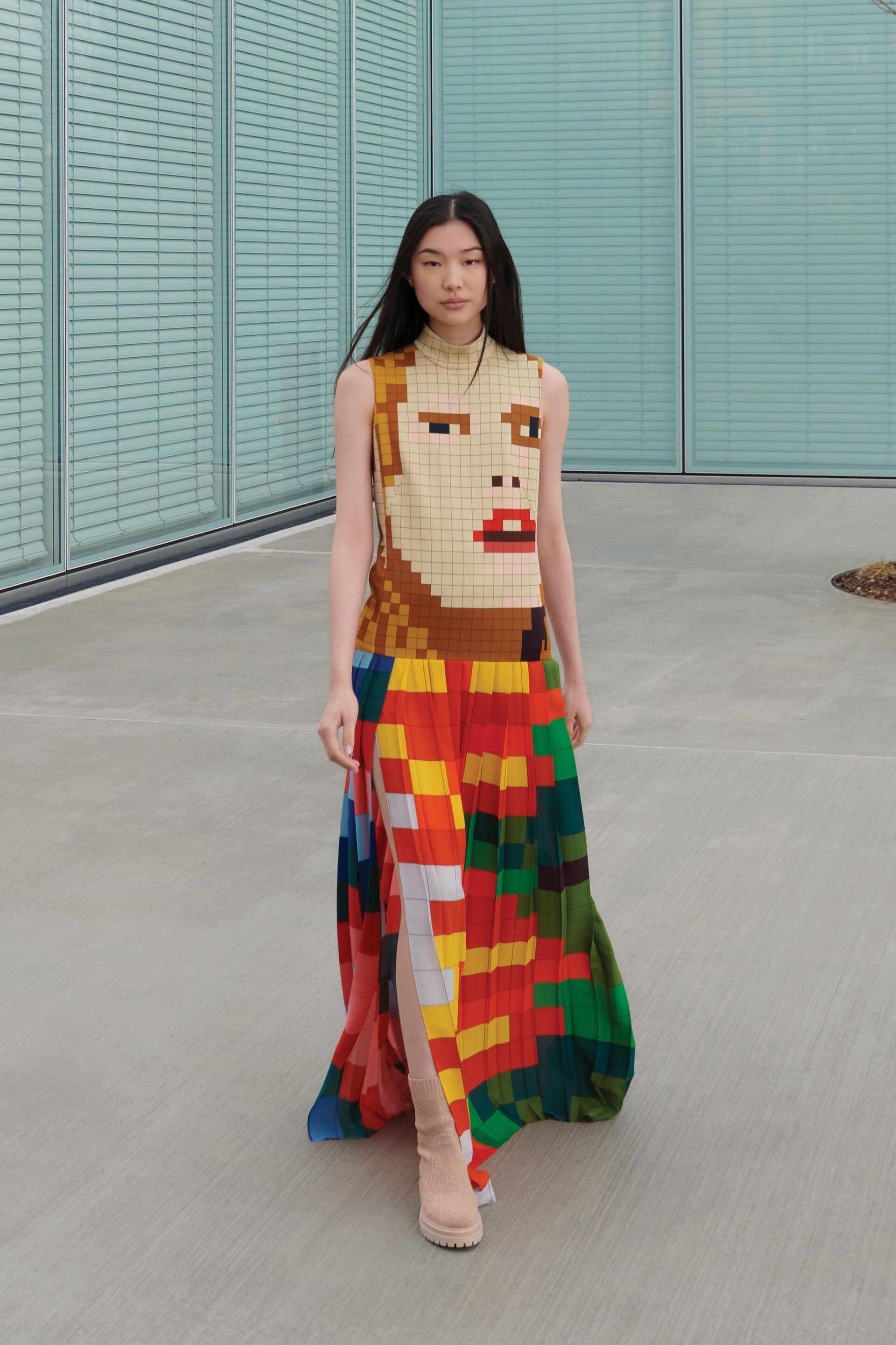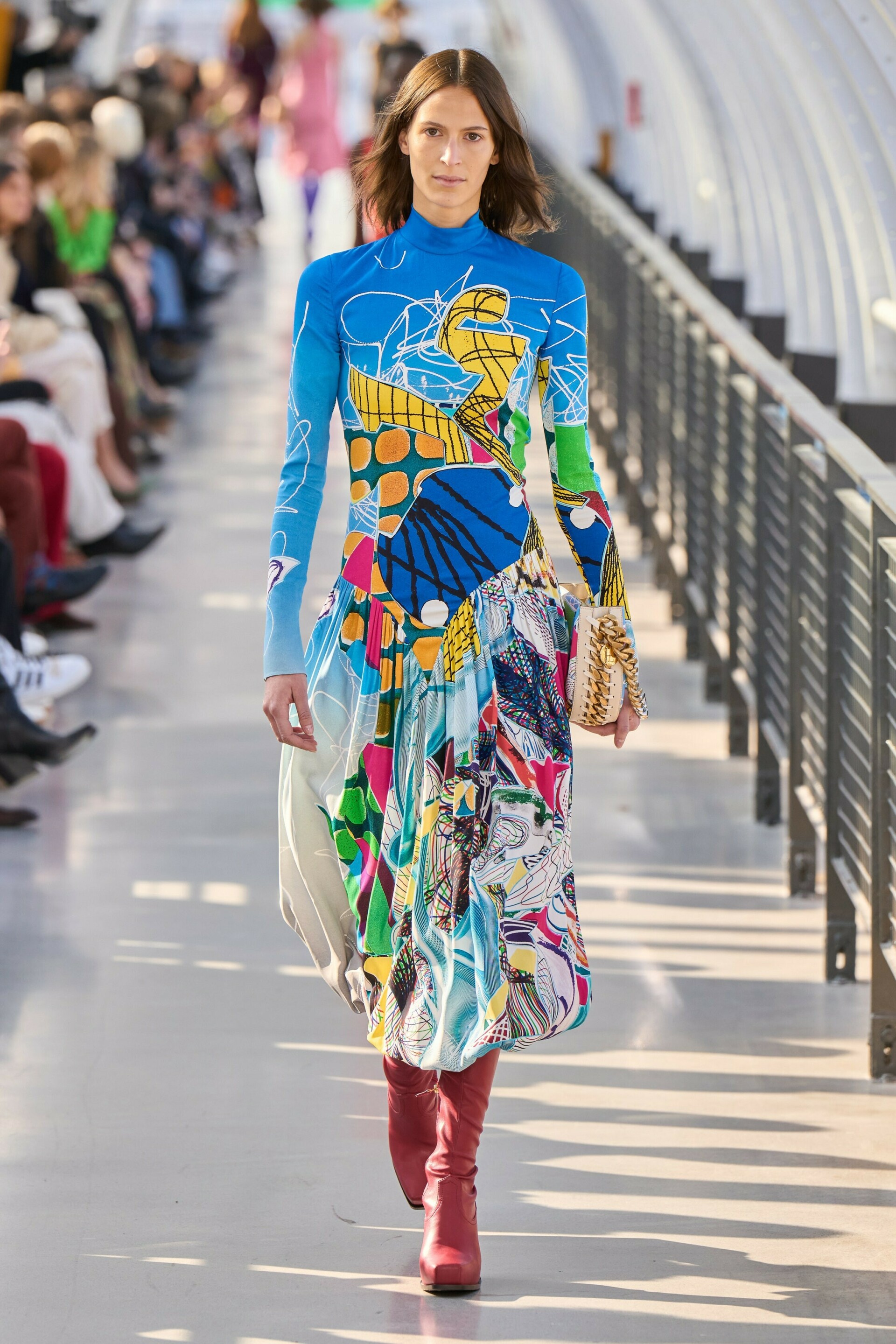 To create the collection, McCartney worked with artist Frank Stella, using his work as inspiration. The parallels between Stella’s work and McCartney’s designs are evident in her use of abstract prints in a minimalist meets maximalist style. On working with the artist, Stella admitted to Vogue it was “scary because he has incredibly good taste”. Despite this, the two came together to create an amalgamation of artsy prints and high fashion silhouettes.