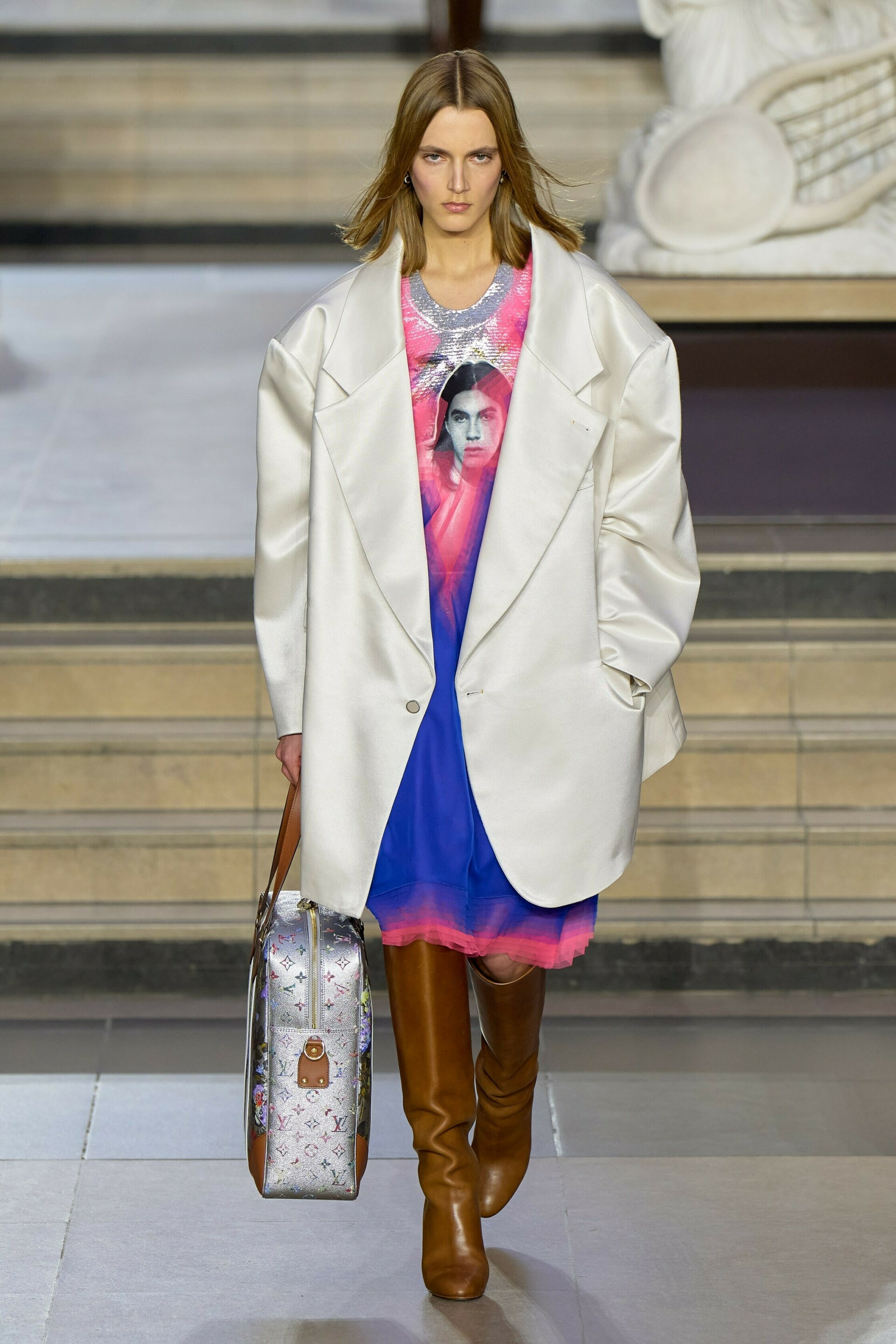 The collection blurred the lines between streetwear and couture silhouettes as loose-fitting sweaters were placed over flaring maxi skirts in floral prints. Playing on the trending old-money style garments, collared sweaters synonymous with vintage golf wear were paired with pocketed dungaree dresses. The quaint collection complemented the romantic marble setting.