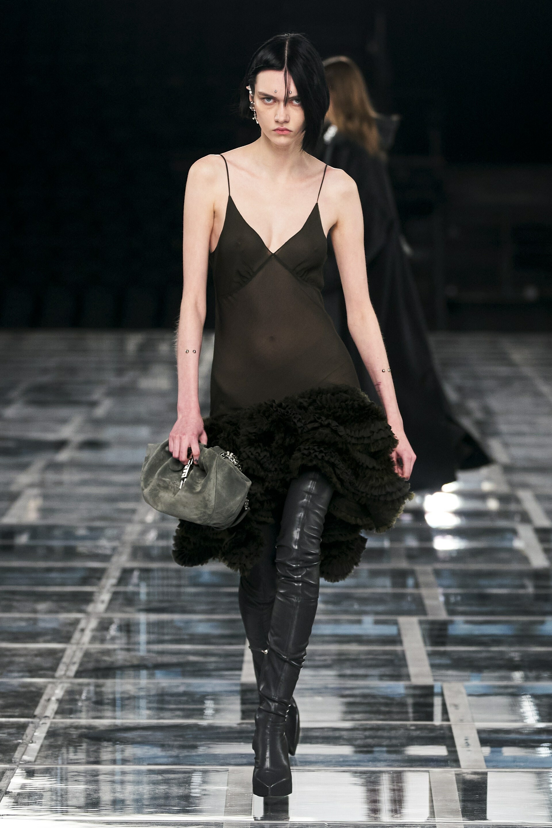 For his FW22 collection, Williams brought nostalgic noughties grunge back to the forefront. Baggy band tees, tight-fitting tanks, and leather boots transported us to the days of Nirvana- fever as fierce models stormed the runway to futuristic beats.