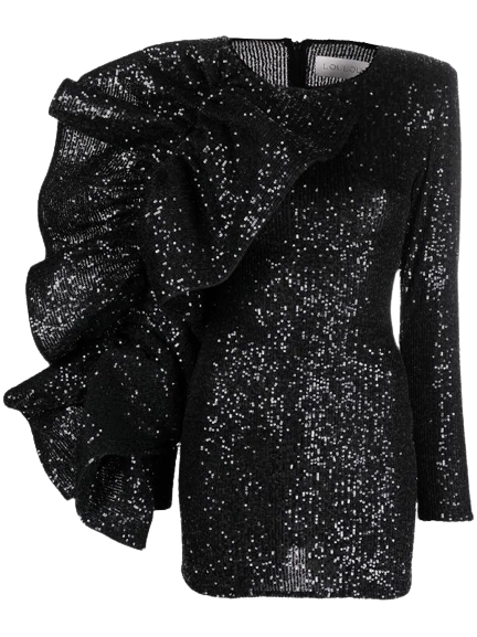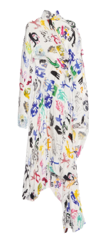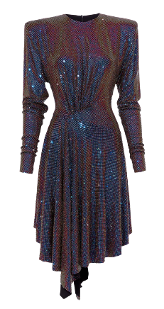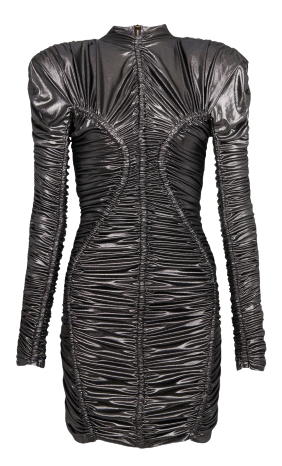 Looking to the runways of 1990s Thierry Mugler for inspiration, Brazilian actress Lancellotti took Paris fashion week’s Little Black Dress trend to futuristic heights. Posing behind a green setting, the star wore a draped- effect, high neck dress by Balmain with a white clutch purse.