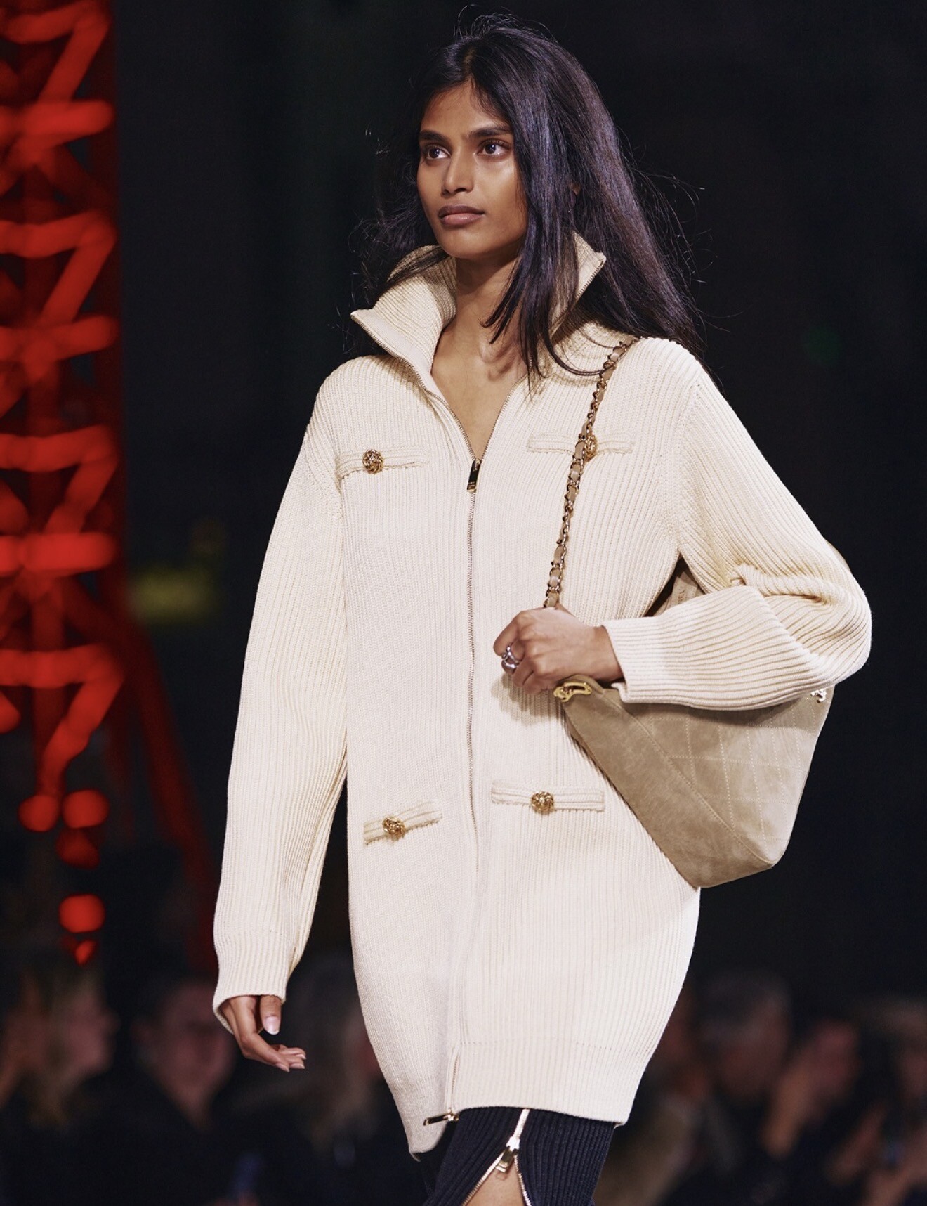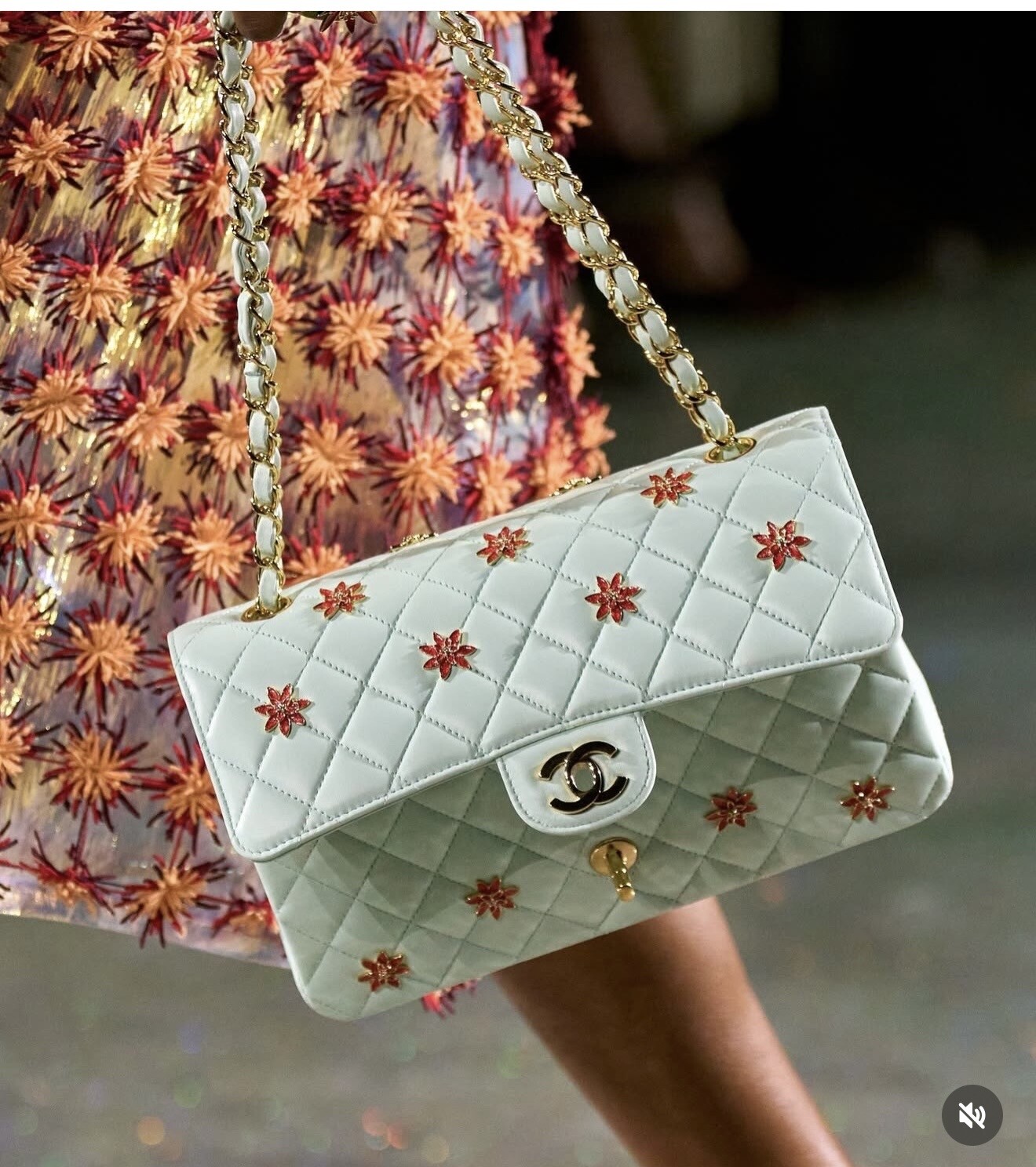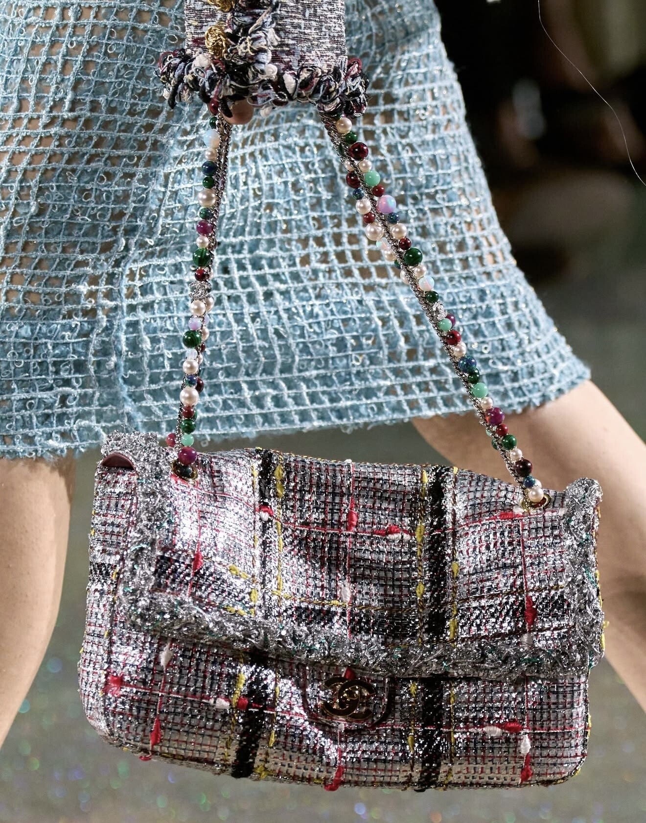 The accessories continued this conversation. The classic Chanel flap bag appeared repeatedly, but