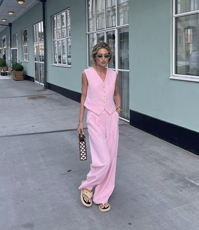 Planning on hustling this summer but don’t want to sweat through your favorite office heels? Well, worry not because with this look, you can grind while keeping your feet (and head) cool. Style a pastel sleeveless suit with some puffed sandals and you’ll be looking forward to showing off your fit at work; just don’t forget to get a cute pedicure to match.