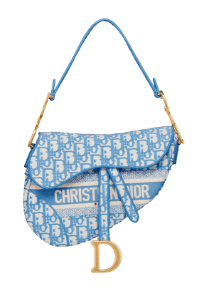 accessorised with a pastel blue Dior purse and white-rimmed shades.