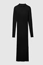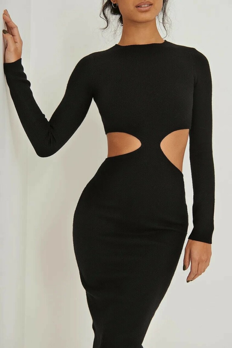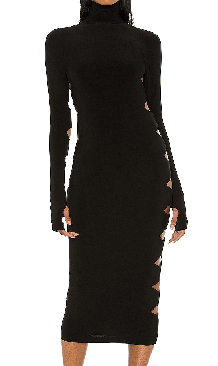 Captioned ‘Into the blue’, Kim is pictured in front of ocean in this stunning high neck long sleeve black bodycon dress that has shows off her curvaceous figure. The dress draws interest to the hip with a cutout tie hip.