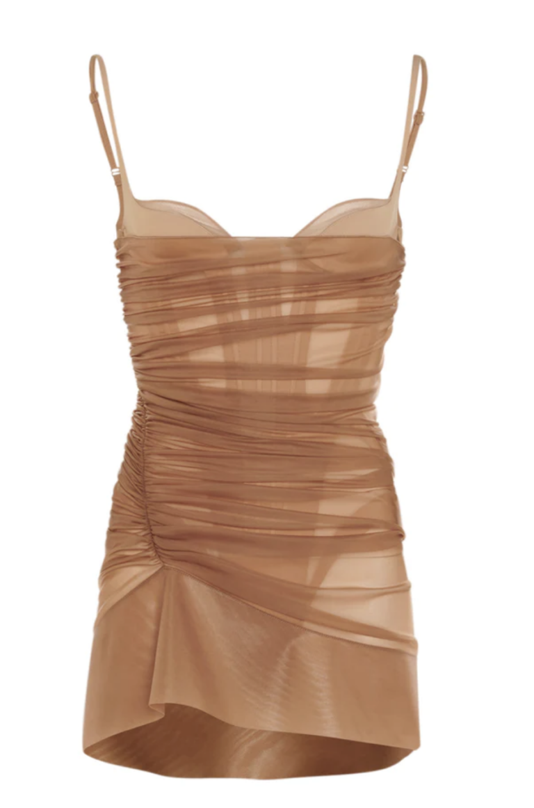 Big Latto received Best New Artist at the BETAwards in this full Mugler outfit. She wears the drape corseted mesh dress from SS22 collection with beige open toe boots.