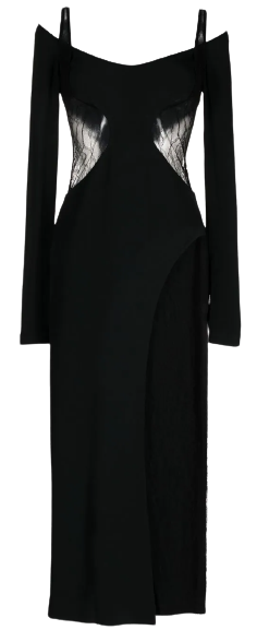 It is black, it is lace, it is Jenna Ortega style. A midi cut, low v-neck, fitting dress is a simply stunning choice. Paired with the high chunky black heels, it is another iconic look for Jenna. The slim silhouette of the dress and strappy shoulders creates a subtle sexiness which is hard to imitate.
