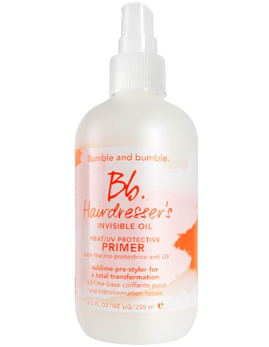 or damp hair. We recommend using it before blow-drying to protect your hair from heat damage. The Bumble and Bumble Invisible Oil/UV Protective Primer is another great product that delivers immediate results. Spray this evenly throughout the hair to achieve frizz-free and detangled hair. It has a light consistency that leaves the hair feeling weightless.