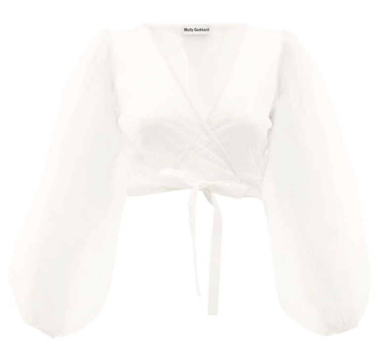 Blue sky summers describes this look worn by Aureta. The stunning Cult Gaia matching set proves that beautiful garments can speak for themselves without over-accessorising. Details of fine pleating and delicate rouching in a luscious blue fabric doesn’t have to be overcomplicated – when styling complex pieces, it’s fine to let the garment shine through. Aureta adds a simple pair of chic black sunglasses, which don’t cover or distract from the interesting top.