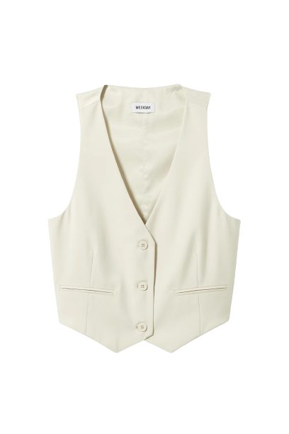 Model Blanca Padilla has summer city casual wear nailed with this combo of beige denim shorts paired with a black belt, white tank top, Frankie Shop Gelso vest and a black crossbody bag. This laid-back look is perfect for warm city days out and museum hopping; add trainers or loafers to complete the chilled look.