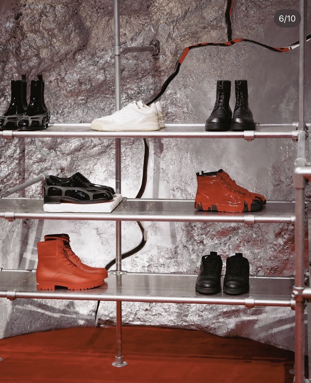 conventional runway. The presentation leaned into theatrical styling, sculptural footwear and