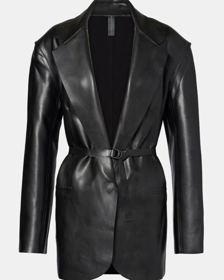 This look is airport cool with a fashion editor twist. The leather blazer adds instant structure and edge, balancing the casual white crop top underneath. The high-waisted, pinstripe wide-leg trousers bring in that borrowed-from-the-boys tailoring while still feeling effortlessly modern. Layered necklaces and rectangular shades add just the right amount of attitude. A large structured tote seals the deal — perfect for keeping all your in-flight essentials stylishly stashed.