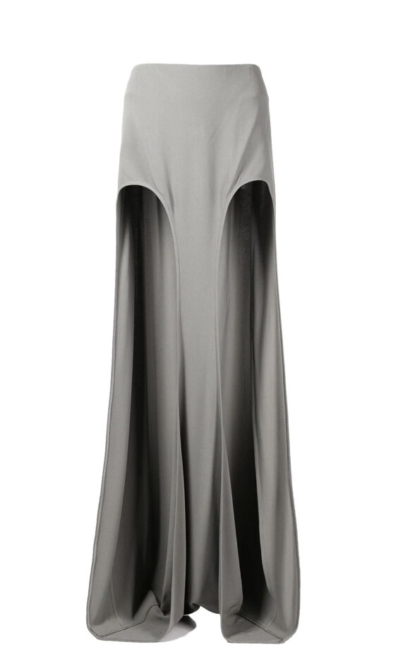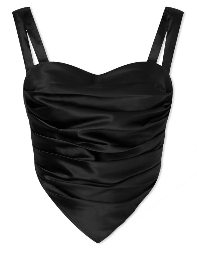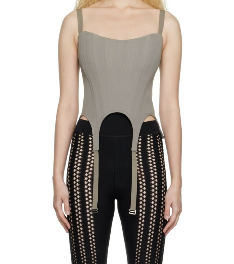 Wandering the streets of NYC, Raye mixes comfy and classy with this look. She wears a Dion Lee co-ord: grey corset tank top and high-low double-arched maxi skirt. For comfort, she wears a pair of Nike Air Force Ones with white gym socks. Her bag of choice is the Ugg x Telfar mini pink and shearling trim crossbody bag, and she wears minimal jewellery, opting for oversized statement hoop earrings.