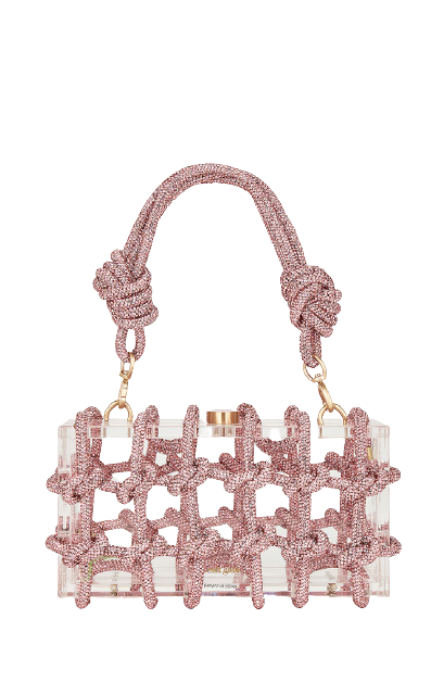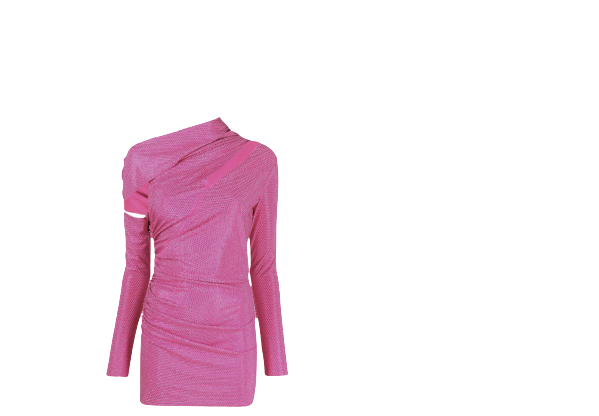 Sami’s chic bathroom selfie shows off her glittery outfit in the best light. She matches this hot pink glittery bodycon dress from Cult Gaia with hot pink and diamonte wrap heels. Her silver diamanté cage bag, also from Cult Gaia, catches the light and adds even more sparkle to the look. Finally, she layers on top a brown, oversized cropped leather jacket from her own vintage label.