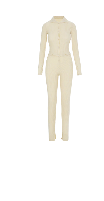 Kicki layers up for the cold Berlin weather in this Adidas x Gucci FW22 knitted co-ord, consisting of a long-sleeve turtleneck jumper, cableknit sweatpants, and a balaclava. She wears black leather gloves to complement the black Adidas logo and three stripes. She spices up the casual outfit with bold makeup: bright pink blush, red lips, and thick winged eyeliner that stands out against her bleached eyebrows and hair.