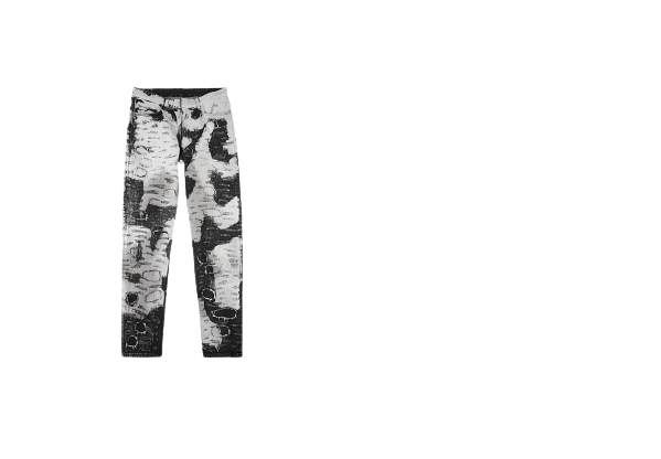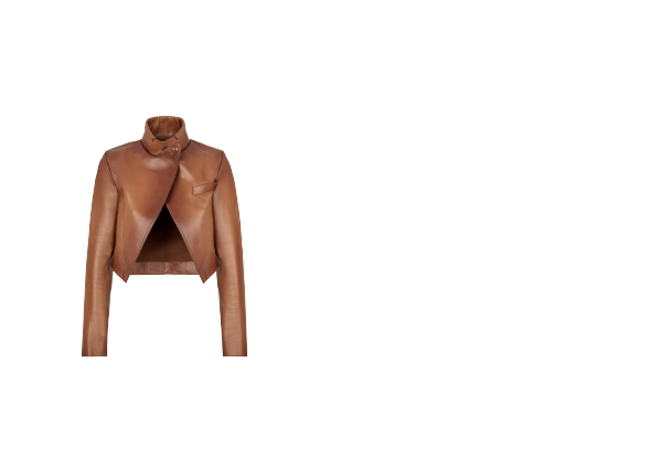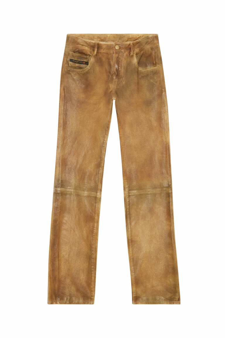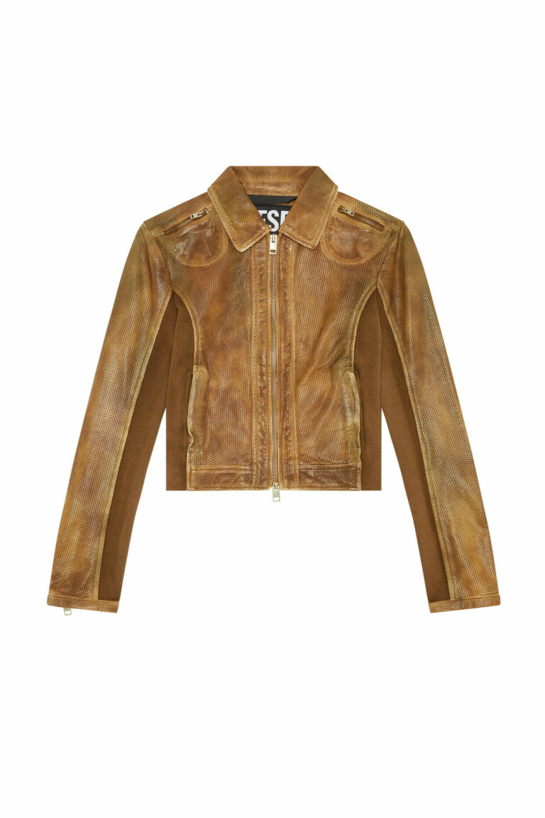 neutral colours to coordinate with the matching Diesel worn-look leather jacket and low-rise trousers. The camel-coloured jacket, with dark panelling, is half unzipped to create an hourglass figure and bring a feminine touch to the biker look. She carries a green and brown distressed baguette bag with bleach spots and a metallic Diesel logo. Adding to the metallic theme, she mixes chunky silver rings with dangling cross earrings. Finally, she wears denim Diesel court shoes with a silver logo to match her jewellery and holographic nails.