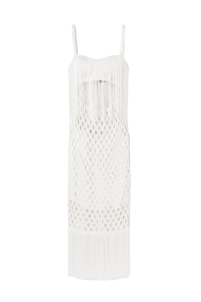 Following on from her Vogue cover, Paloma put together this monochrome look for the Sulwhasoo beauty event at the MET museum. Giving major tropical island energy, she layers a crisscross crochet tank over a mesh bra and pairs it with a white nylon bubble skirt and chunky bubble slip-on wedges— all from Proenza Schouler. The all-white look makes her tan pop, and her slick-back hair and natural makeup give her that glowy holiday look. She accessorises with a metallic bar clutch, also from Proenza Schouler.
