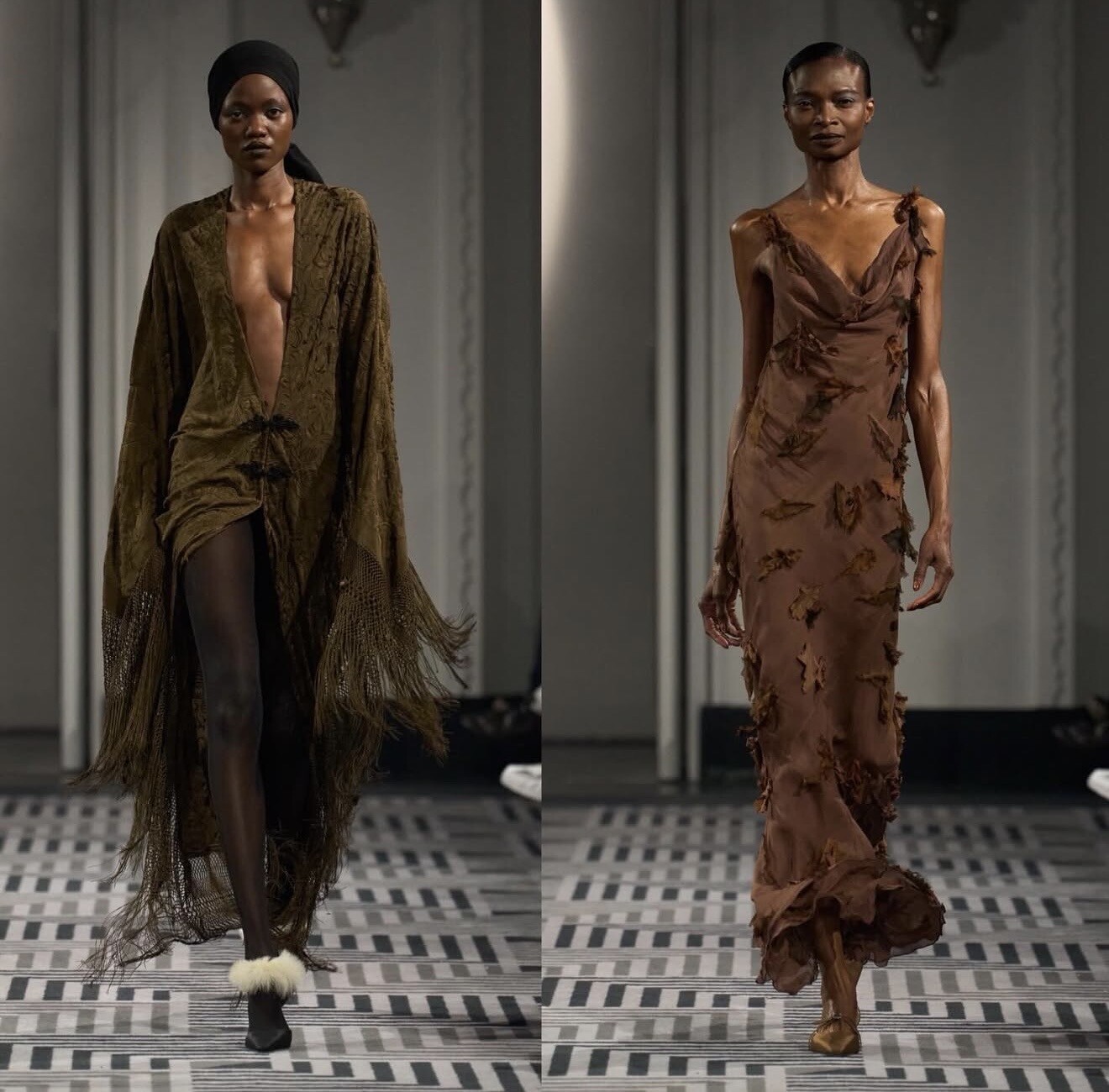 Presented at Claridge’s, Conner Ives’ show stood in contrast to larger productions. Guests sat close enough to observe reconstructed fabrics and hand-finished details, reinforcing the designer’s commitment to sustainability through storytelling.