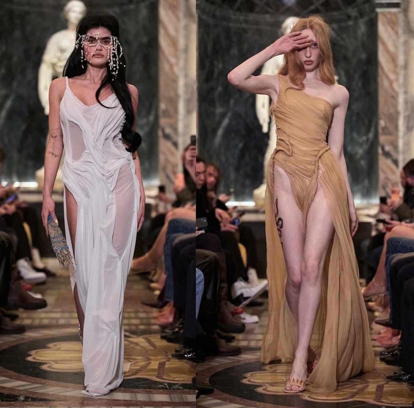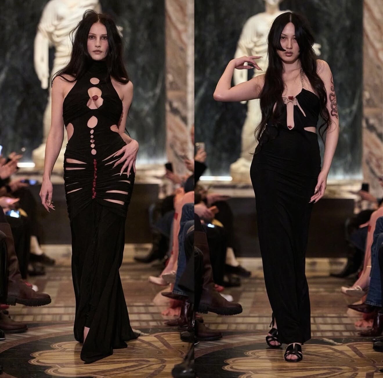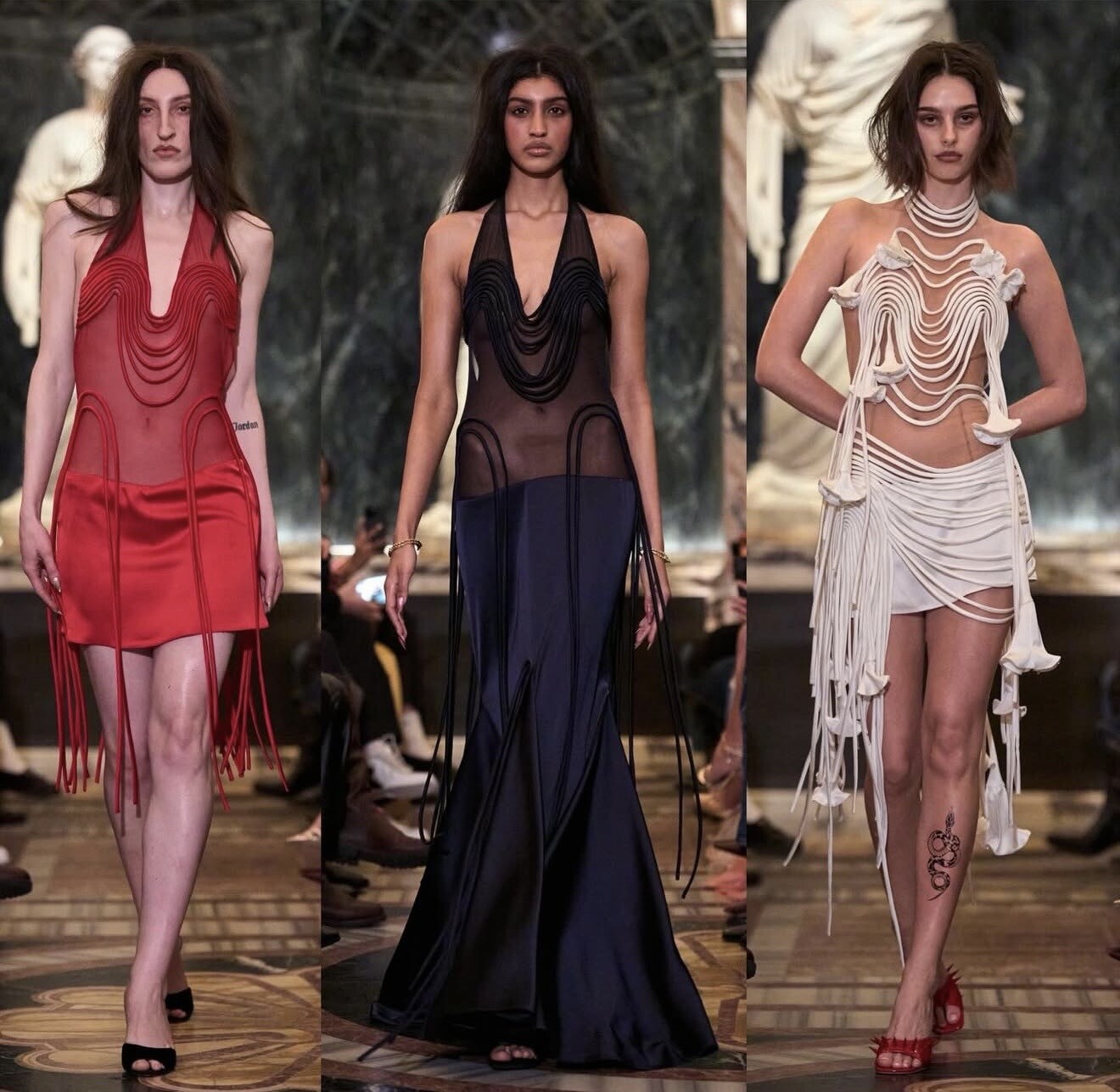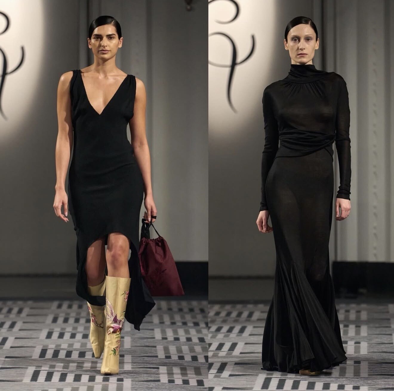 Di Petsa closed her presentation with signature wet-look draping that moved like liquid across the body. The collection explored sensuality through empowerment, celebrating natural form and emotional vulnerability.