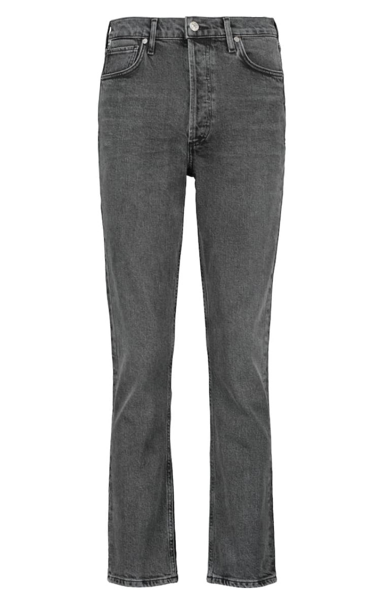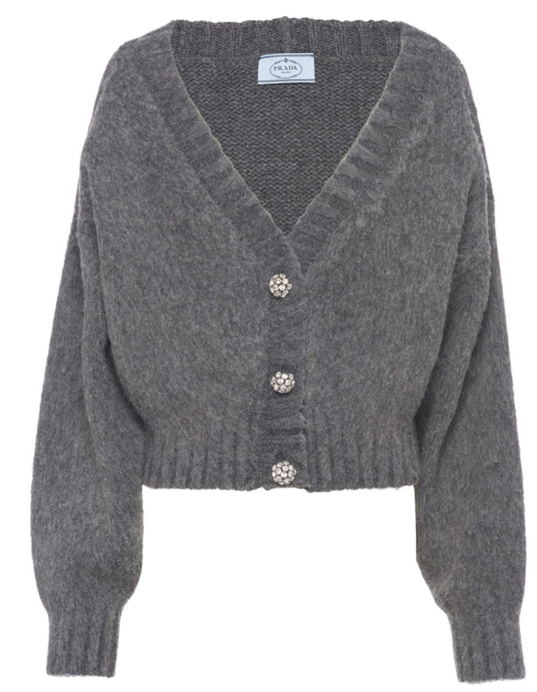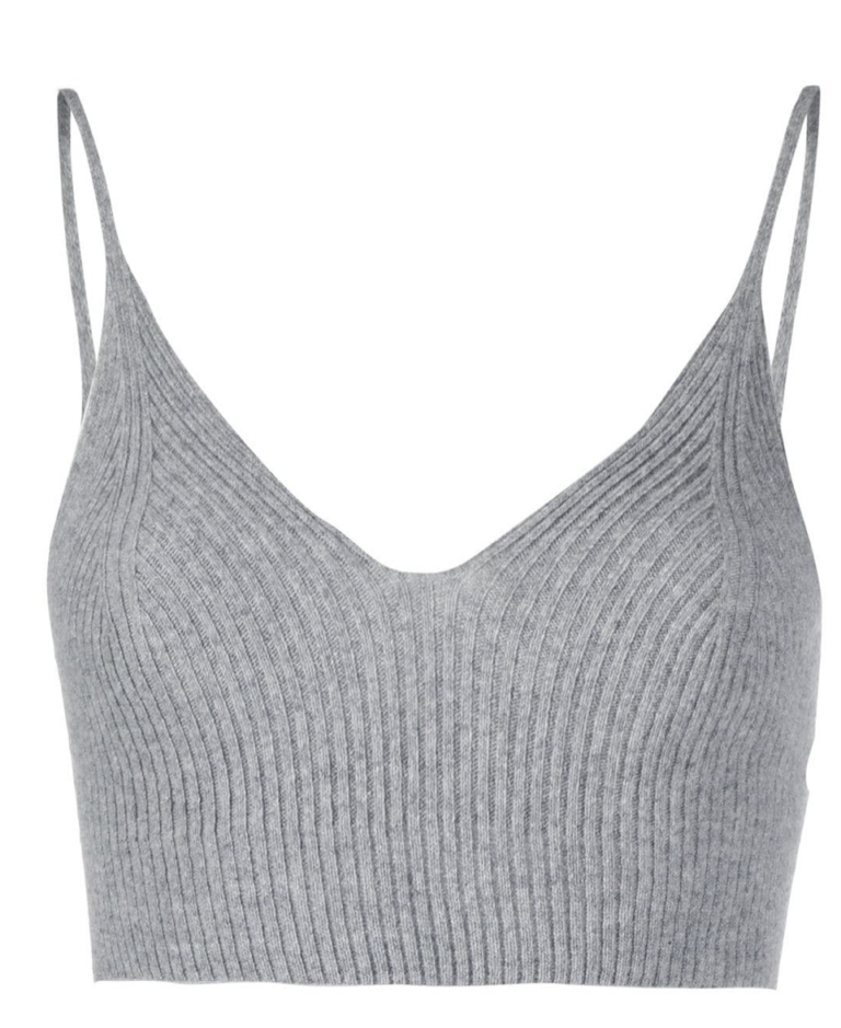 Megan wears a monochrome look with a bold-coloured accessory to add brightness to her outfit. Pair a grey bralette top with these high waisted jeans and cardigan. To accessorize, add these silver earrings, yellow tote and sparkly Amina Muaddi heels.