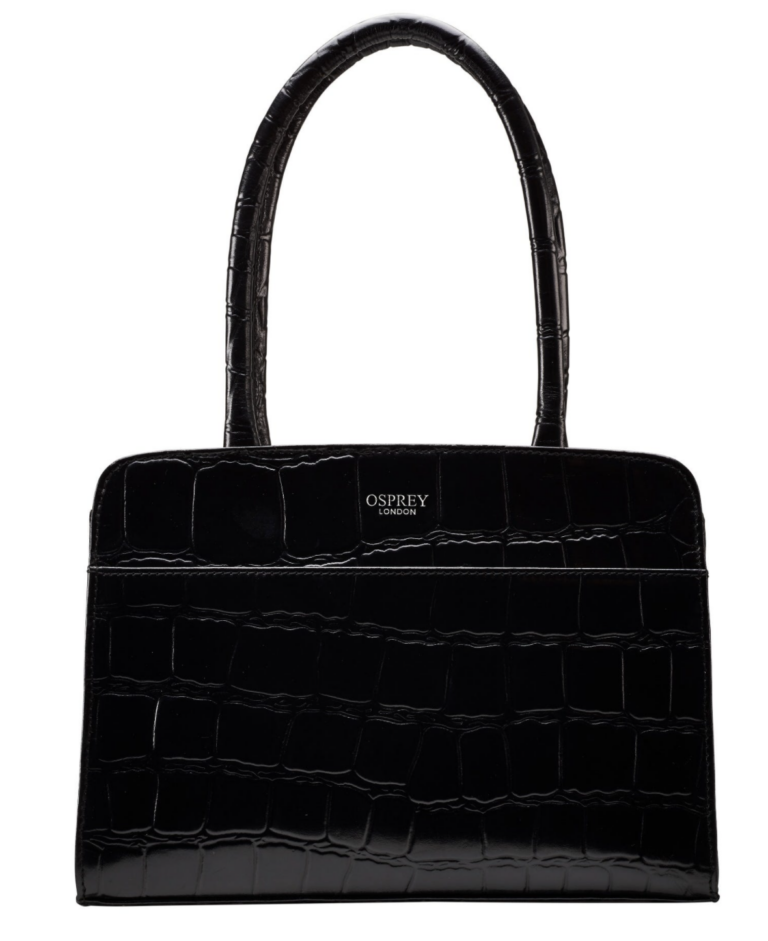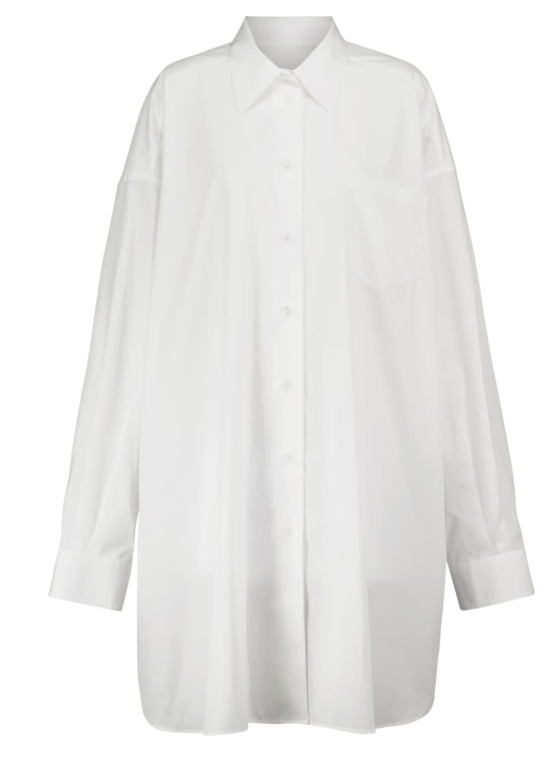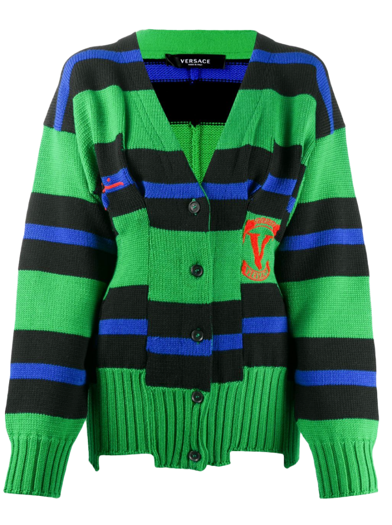 Megan wears a striped cardi over a crisp white shirt and boots. Get the look with this shirt dress, matching green satchel bag and platform boots. Pair this look with simple red earrings.