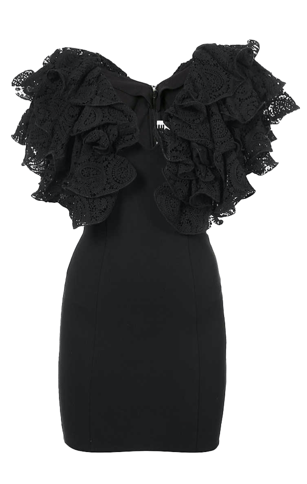 This little black dress is flattering on the figure and the shoulders contrast and accentuate the waist. Try this dress with the ruffle details on the shoulders. Wear with these black sandal heels and silver jewelry to complete the look.
