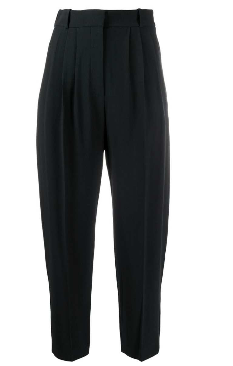 Casual yet chic, Megan pairs a wide leg with sneakers, a beanie and a Prada shoulder bag. Get the look with this Burberry print cardigan, crop top, beanie and sneakers. The wide leg trousers give a more put together vibe to this casual and comfy ensemble.