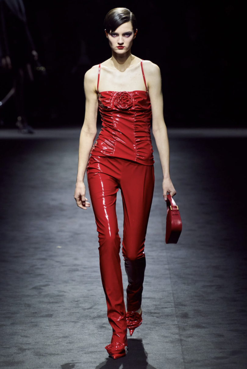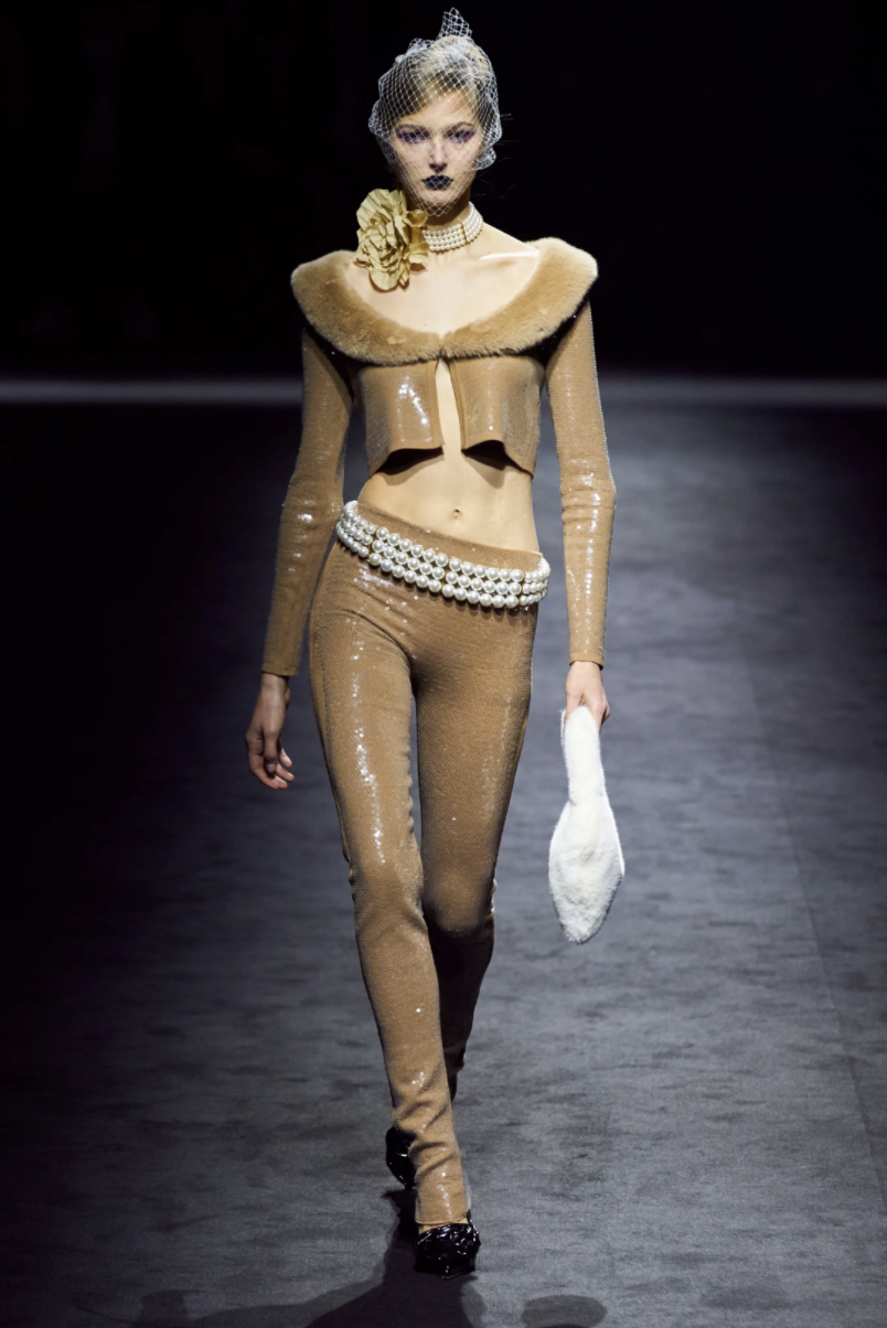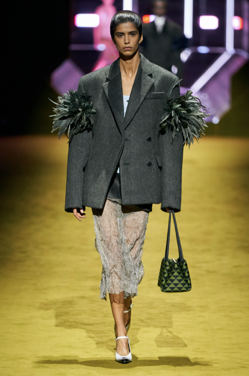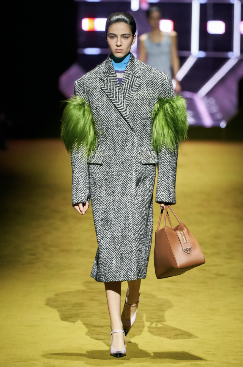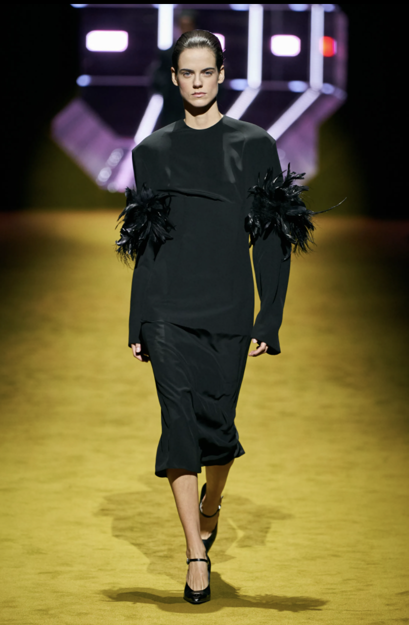 brand’s trademark triangle logo, and delicate fur trims- a feminine but futuristic ensemble.