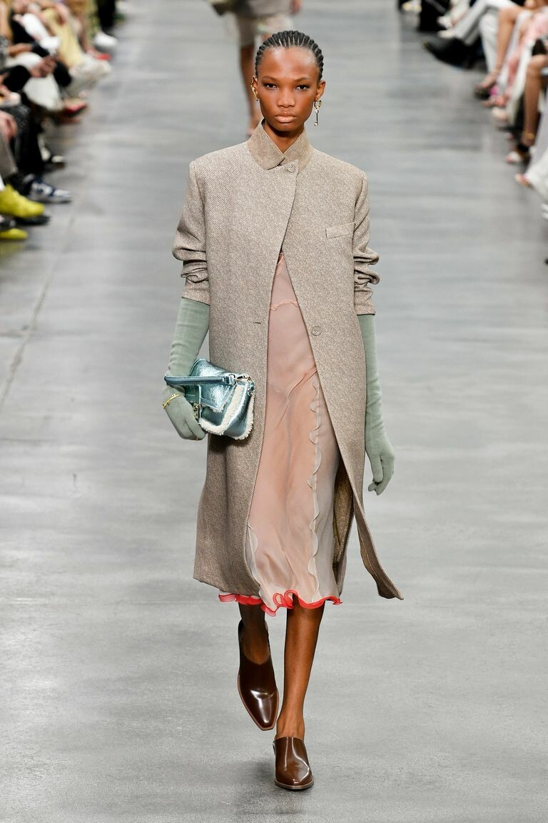 Fendi chose to contrast hard tweed and soft chiffon to celebrate women’s contrasting