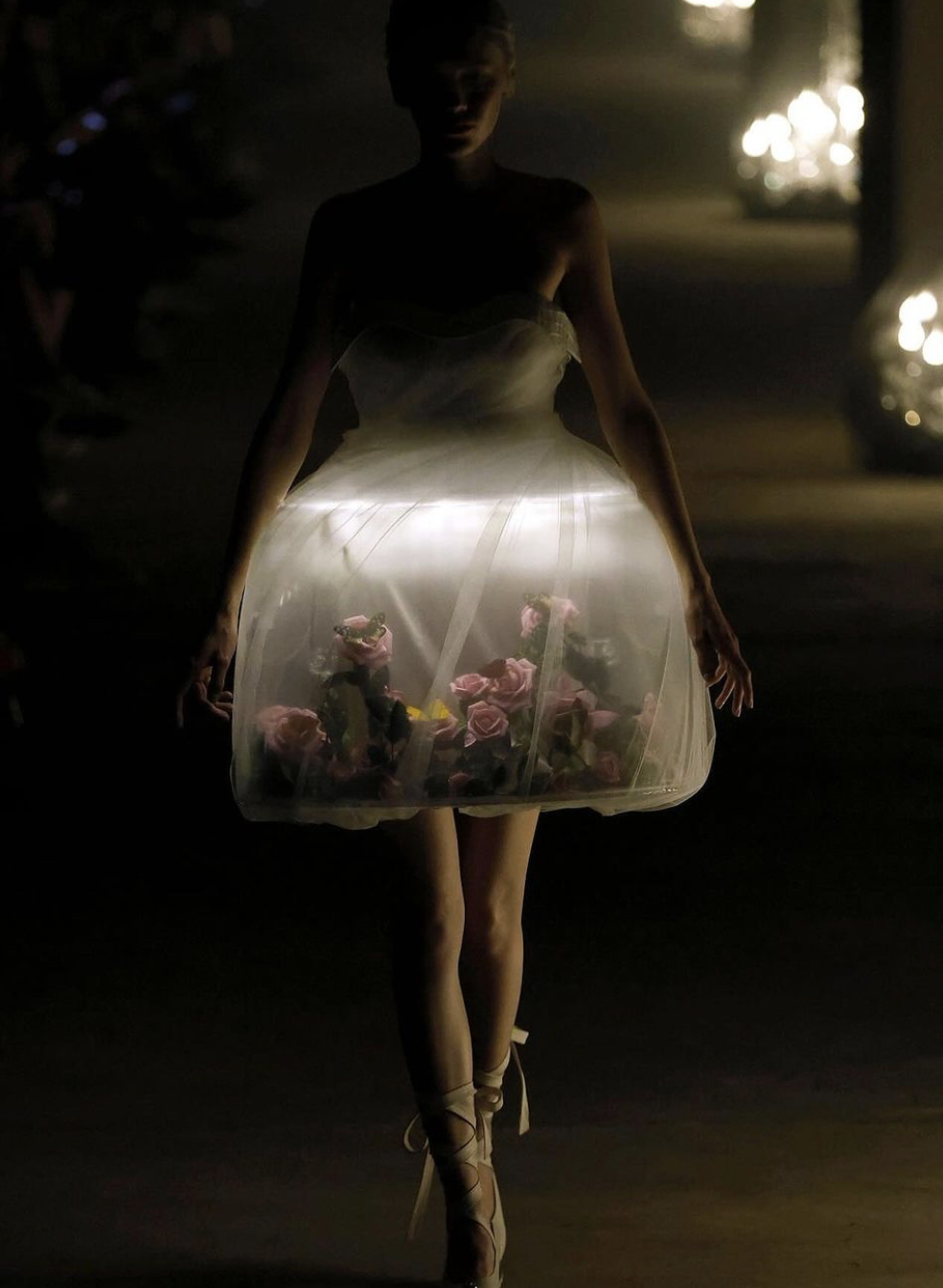 After the lights dimmed at Undercover, we assumed the finale had just occurred, but as gasps and exclamations echoed from the beginning of the runway, we knew we were about to witness fashion history. Three models were languishing down the runway wearing glow-in-the-dark birdcage dresses with live gardens and butterflies inside. The glasshouse 3D pieces are one of the most talked about moments of the season, so it’s to one’s surprise that the designer responsible is the ever-inventive Jun Takahashi. Even the harsh, fan-favorite critic @hautelemaude was impressed. Unlike the one-and-done marketing gimmicks we’re used to seeing from brands, the dresses seamlessly blended with the rest of the collection and its theme: the surreal contrast between dark and light. Backstage Takahashi shared that “He feels like he’s stuck in the world, but he wants to release himself.”
