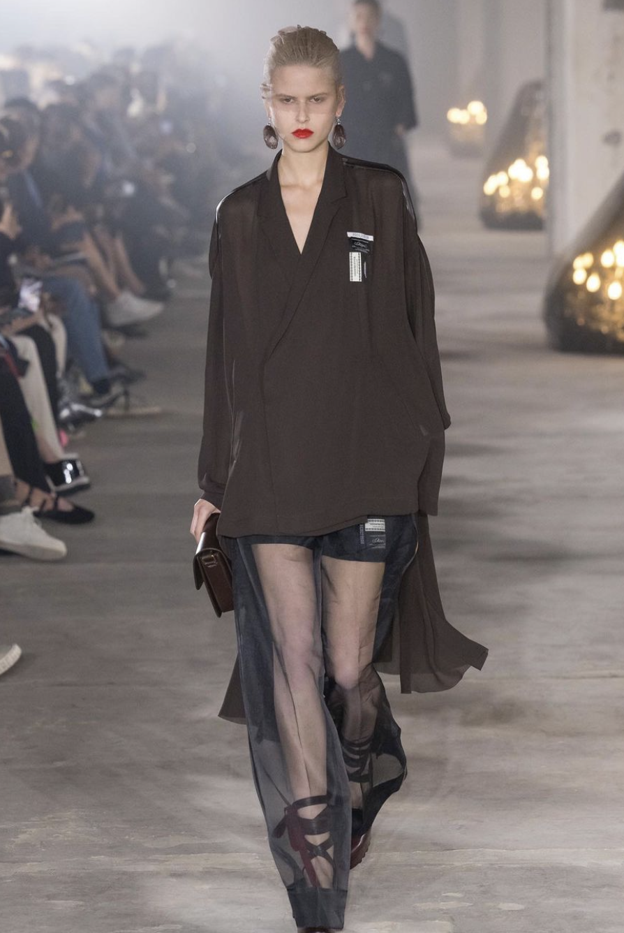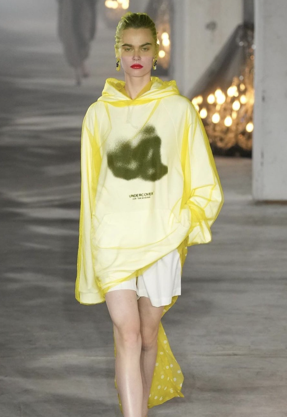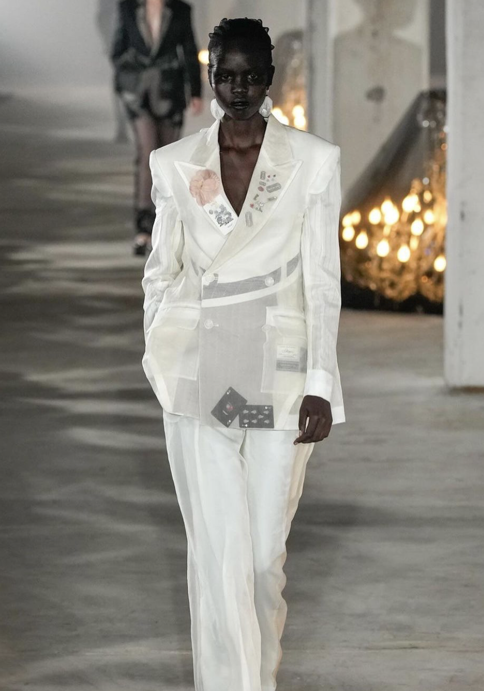 This sense of existing in limbo was in the see-through veils and loose, feminine silhouettes that billowed like fading memories. The opening sheer tailored suits showed razors, playing cards, and flowers trapped in between the front and back layers. Georgette black suits, bedazzled spider embellishments, and faded t-shirts made the collection look like workwear rinsed in a cauldron. A somber color palette gave way to polka dots and bright yellow, followed by graphic co-ord sets of Neo Rauch’s paintings that perfectly conveyed that surrealist feeling. Tulle was everywhere; overlaying hoodies, as shoulder pads, and even crunched up as portraits from his first oil painting exhibition shown earlier this month, “They See More Than You Can See”.