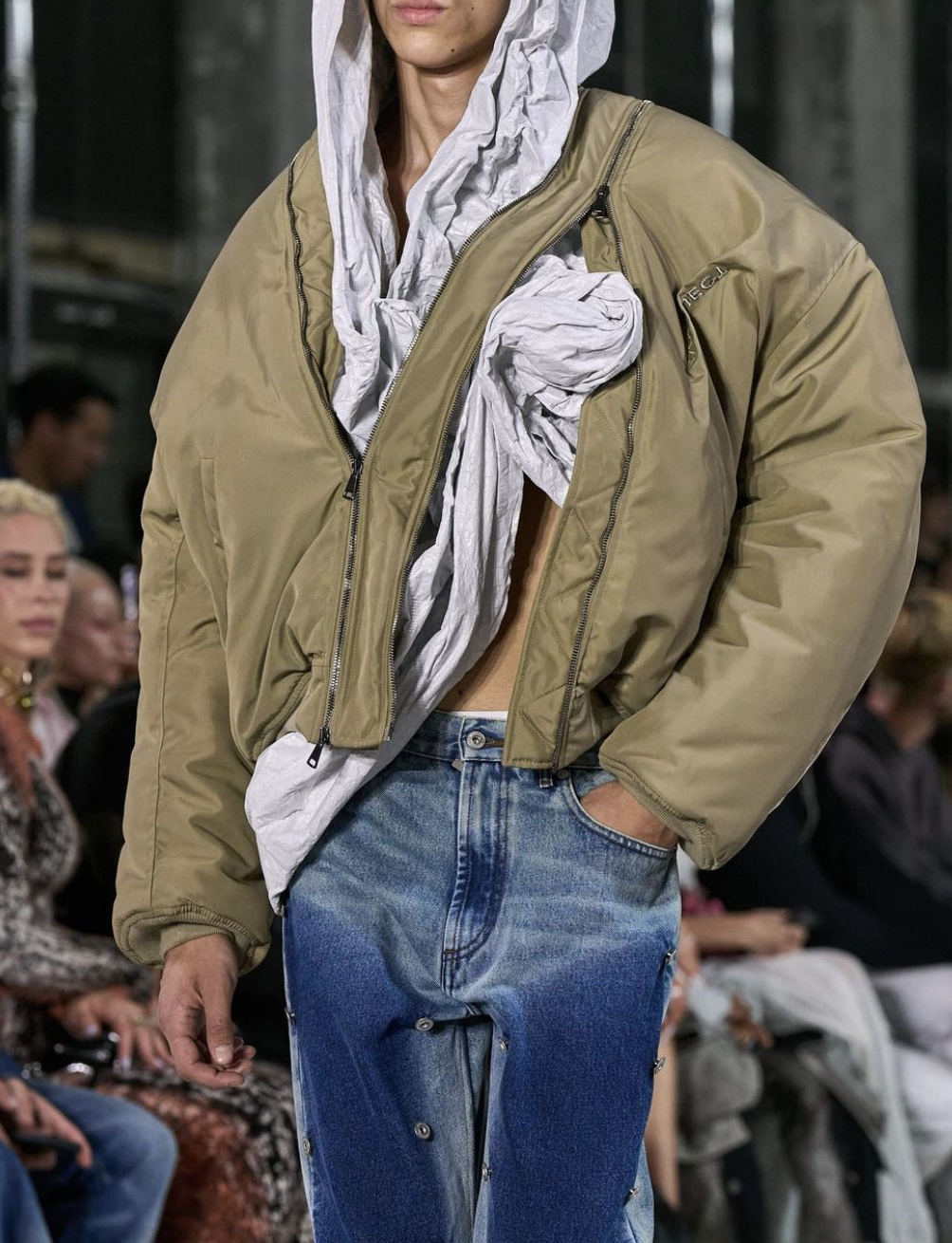 After hosting a 6,000-person rave in Milan for the Diesel show, pressure and anticipation were high for Glenn Martens’ Y Project show. The standing-only room front row was crowded with the same young stylish people gathered outside the venue, making the inside look like superfans had sneaked past security and PR instead of invite-only. And with Martens’ reputation as fashion’s newest wunderkind, they might as well be crazed fanatics.