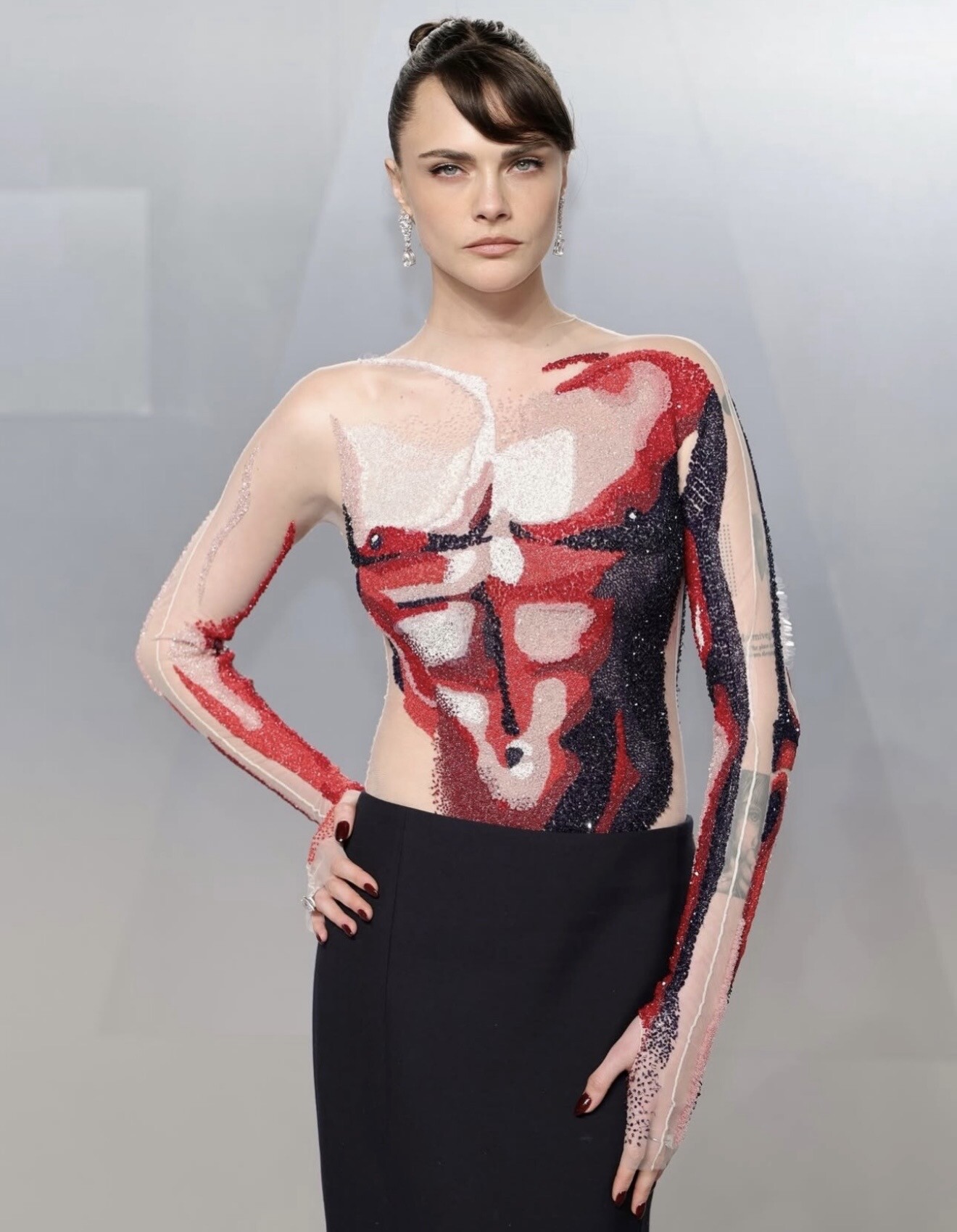 Cara Delevingne delivered one of the night’s most visually striking moments in a conceptual Thom Browne anatomical design, transforming the body into illusion and blurring the boundary between fashion and art.
