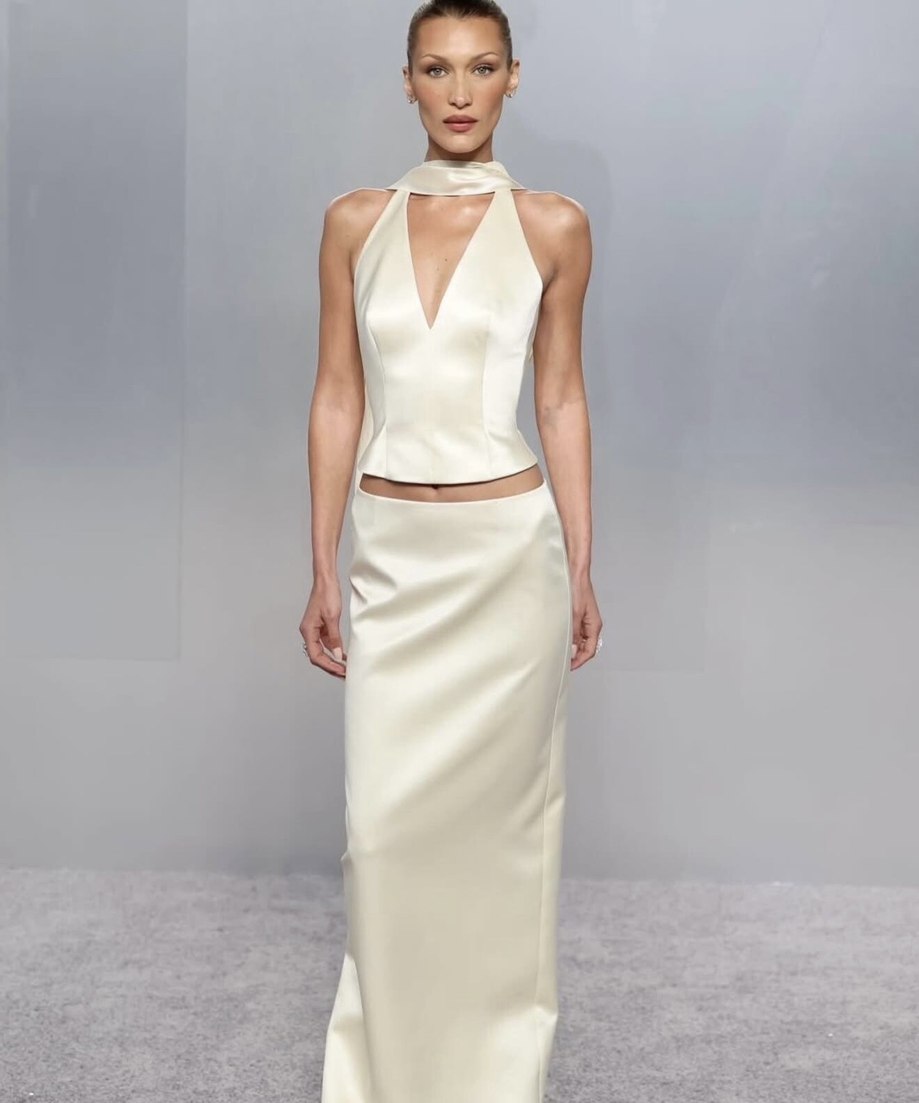 Kim Kardashian leaned into high-shine glamour in a liquid gold Gucci gown, its molten finish sculpting the body with precision. Amelia Gray closed out the lineup in a sleek Revolve look, underscoring the growing interplay between established luxury houses and contemporary fashion platforms.