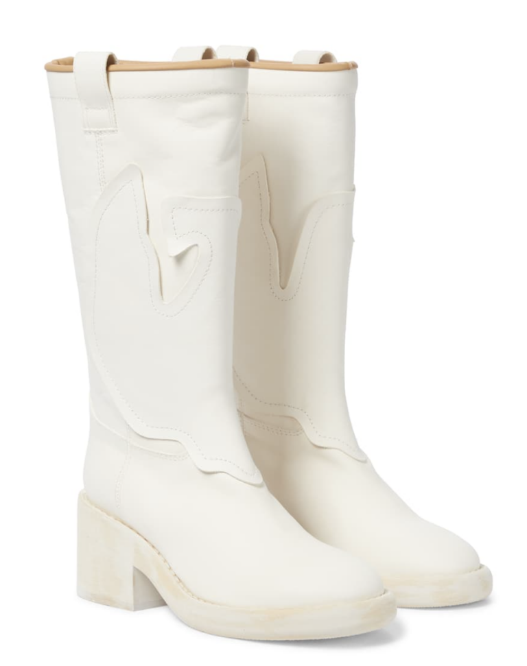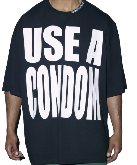 Rihanna is the funniest mother out there, wearing this Savage X Fenty ‘use a condom’ baggy t-shirt while pregnant. She made the graphic t-shirt stylish by pairing it with wrinkled white leather boots from Amina Muaddi and white-rimmed sunglasses from the Gentle Monster x Maison Margiela collab.