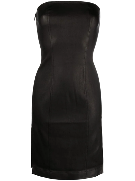 On a trip to Paris, Kylie wore this monochrome look for dinner at César. She wore this black bandeau dress from Ludovic de Saint Sernin, layering a baggy leather jacket on top. She kept the all-black theme going with some black heels, a black clutch, and black sunglasses.