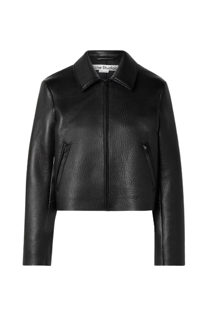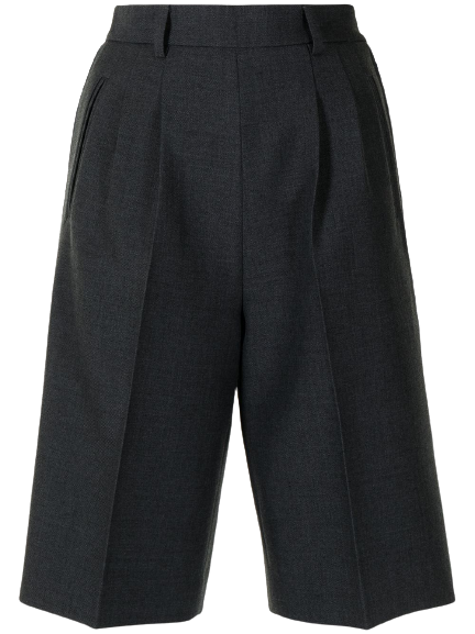 The super stylish jewellery designer wore this edgy street style look, layering a huge oversized leather bomber jacket over a dark-wash denim zip-up top. She went for office-chic on the bottom half, wearing these low-rise grey grandpa shorts. She finished the look off with tall white boots, a denim bag from Alexander Wang, and stacked chains from her own brand.