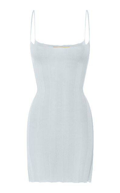 In this photo, Jocelyn wears the Merano Knit Mini Dress from Aya Muse in blue from the resort 22 collection. The semi-transparent dress features vertical stripes and she has paired it with a silk evening bag with diamanté chains.