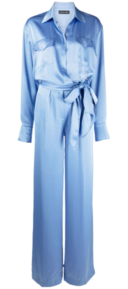 Maya Jama attended a boxing match this weekend in a light blue satin long-sleeve jumpsuit by David Koma. The outfit revealed her breast and collar bones but also enhanced her body shape. She accessorised the one piece with a pair of vintage YSL crystal half flower earrings in a gold tone. Maya had her hair in a slick ponytail with side swept bangs and opted for a neutral makeup look with black winged eyeliner.