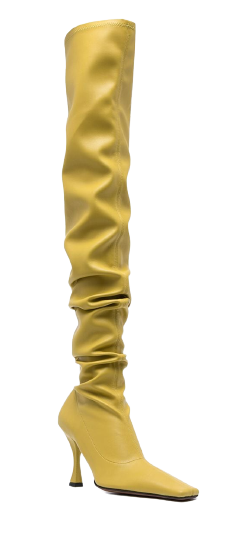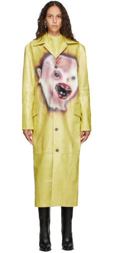 Aleali May showed us her last look of her week in Paris wearing a range of designers and styles. She went with a vintage Versace turquoise mini skirt with straps in a darker shade, and on top she wore a Mowalola yellow panelled grained leather coat with a multicolour graphic printed at the front. To match these, she wore a pair of shiny heeled boots by Sun Woo and bright green sunglasses.
