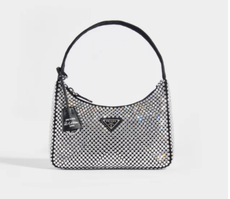 Pictured on the left is a crossbody bag by Rabanne covered in mirrored discs and modelled with inspiration from Rabanne’s iconic 1969 collection – one of their first ever creations. On the right, and as described on Cocoon Club’s website, is the Prada Hobo Re-edition 2000s Nylon with Crystals in Black. This handbag will not fall short of dazzling everyone at the party with its embellished crystals.