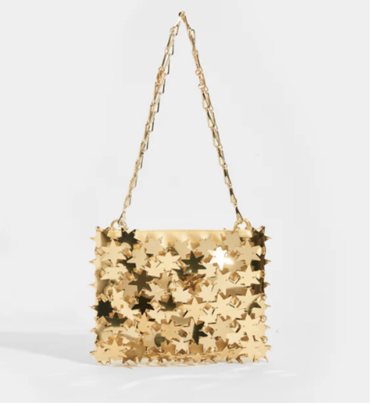 Of course, gold is also a go to party colour you must consider. This Rabanne Comet Shoulder Bag covered in gold stars captures the essence of a NYE party and is part of the 1969 re-creations inspired by the designer’s first ever collections. It comes with gold chain straps for ‘easy and fuss-free wear’ says Cocoon Club.